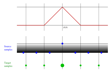 All the other target pixels should be completely black. When we center the filter on any other target sample, all the source samples within its domain are 0. For example: